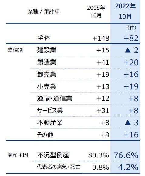 2008年10月は大手ゼネコンやマンション開発など建設・不動産業界の倒産が急増。「製造業」(+41件)も急激な内外需の縮小と円高進行で急増した。一方、2022年10月は減少した前年の反動増の側面がある一方、「物価高」「円安」「人手不足」のトリプルパンチで、特に原材料の大幅な値上がりが続く食品関係の業種が増加した。