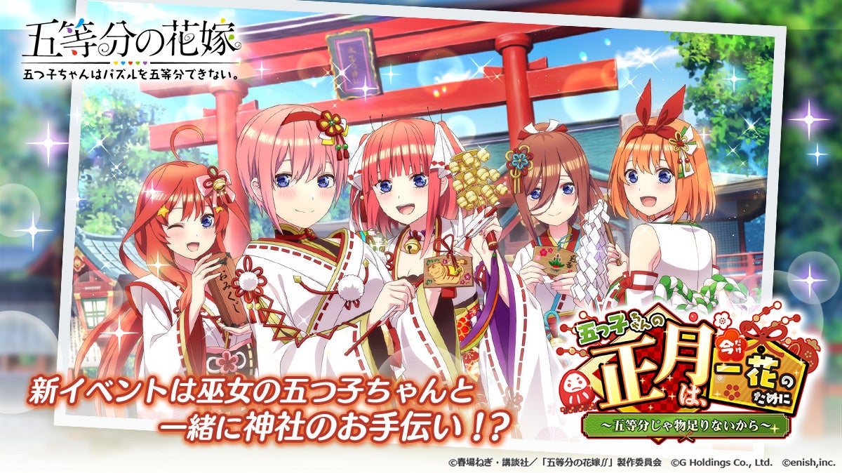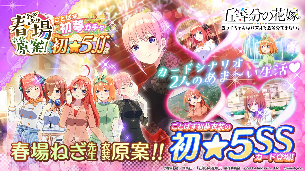 株式会社enish(本社:東京都港区、代表取締役社長:安徳 孝平、以下enish)は、アニメ「五等分の花嫁」初となるゲームアプリ『五等分の花嫁 五つ子ちゃんはパズルを五等分できない。』において、2022年1月1日(土)より、待望の春場ねぎ先生原案!週刊少年マガジン編集部完全監修のゲームオリジナル夢のストーリーをフルボイスでお楽しみいただける「ごとぱず初夢ガチャ」を公開いたします。