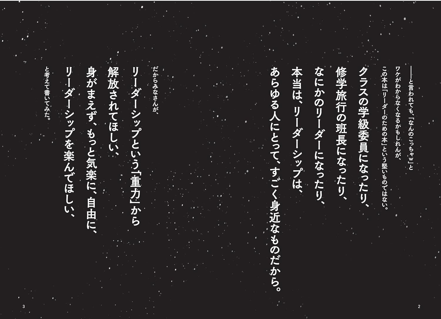 リーダーとは何かについて議論されるとき、「こうあらねばならない」という「べき論」で語られることが多い。このような固定観念は、地球に働く「重力」のようなものであり、こうした考え方は現代、通用しづらくなっている。本来、リーダーシップとは、クラスで学級委員長になったり、修学旅⾏の班長になったり、なにかのリーダーになったり、あらゆる人にとって、すごく身近なものだ。