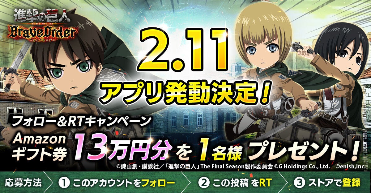 株式会社enish(本社:東京都港区、代表取締役社長:安徳 孝平、以下enish)は、アニメ『進撃の巨人』のスマートフォンゲーム最新作「進撃の巨人Brave Order」の配信日が2022年2月11日に決定いたしましたのでお知らせいたします。また、こちらを記念いたしましてゲームアプリ公式Twitterアカウントにてキャンペーンを開催いたします。最新情報は、ゲーム公式サイト・ゲーム公式Twitterアカウントにて随時公開して行きますので、ぜひご覧ください。