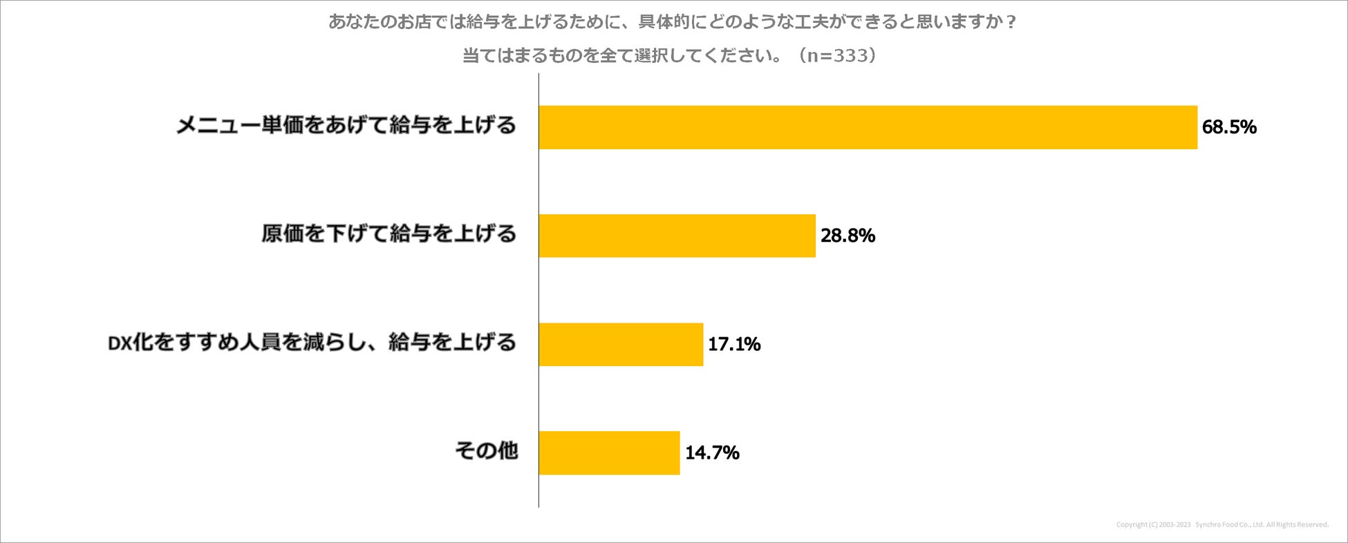 続いて、給与を上げるために、具体的にどのような工夫ができるか質問しました。すると、最も多かったのは「メニュー単価をあげて給与を上げる」との回答で68.5%。食材の原価を下げる、人員削減を行うといった方法よりも、人件費の上昇分は価格転嫁によって回収したいという店舗が多く見られました。