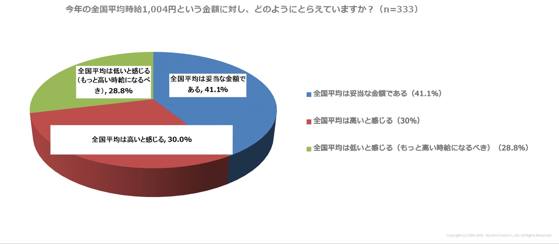 一方で、「全国平均は高いと感じる」が30.0%、「全国平均は低いと感じる(もっと高い時給になるべき)」が28.8%と、店舗によって意見が分かれる結果となりました。