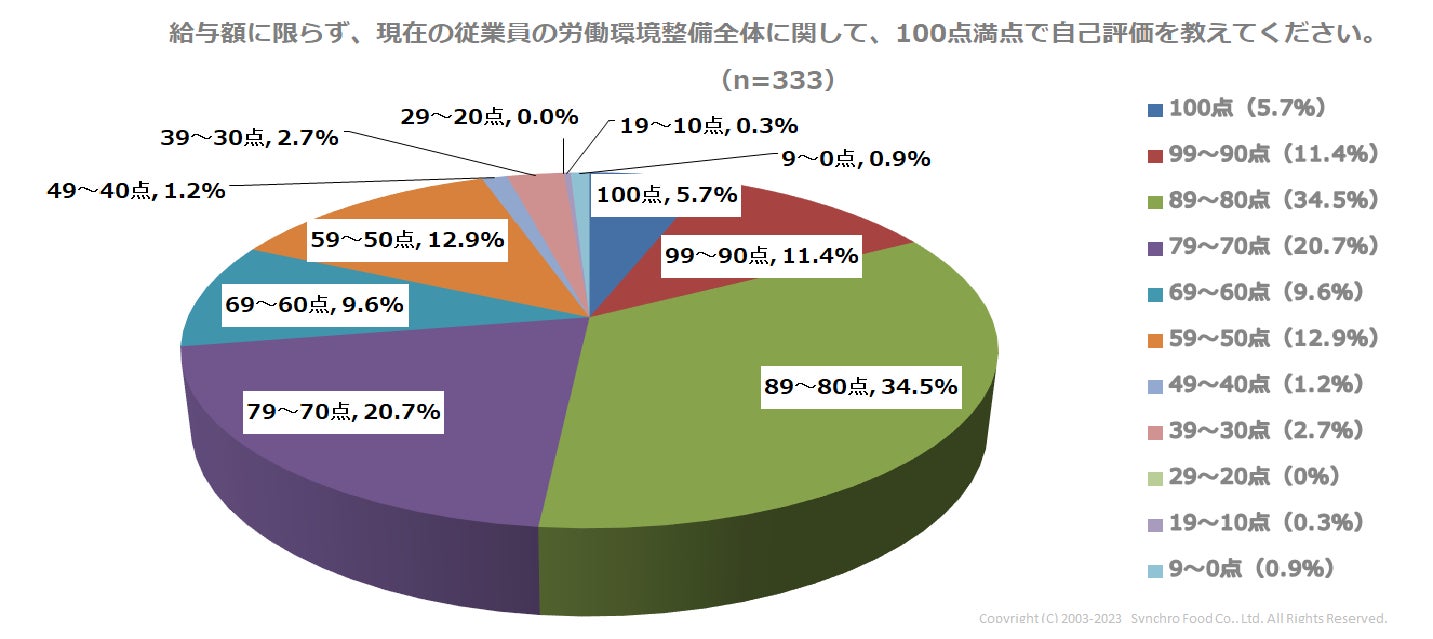 従業員の労働環境整備に対する自己評価は、半数以上が「80点以上」