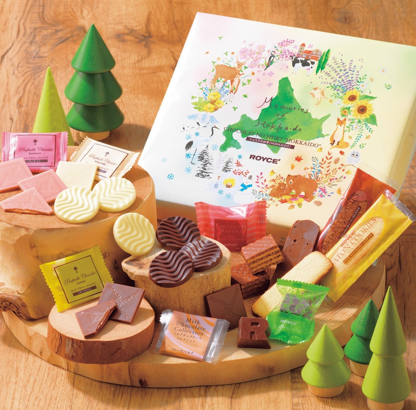 色や素材から、北海道の四季をイメージできるロイズのチョコレートをセレクトした詰め合わせです。パッケージには、北海道に住む動物や、北海道の四季折々の植物を描いており、北海道への旅気分を感じられるひと箱です。