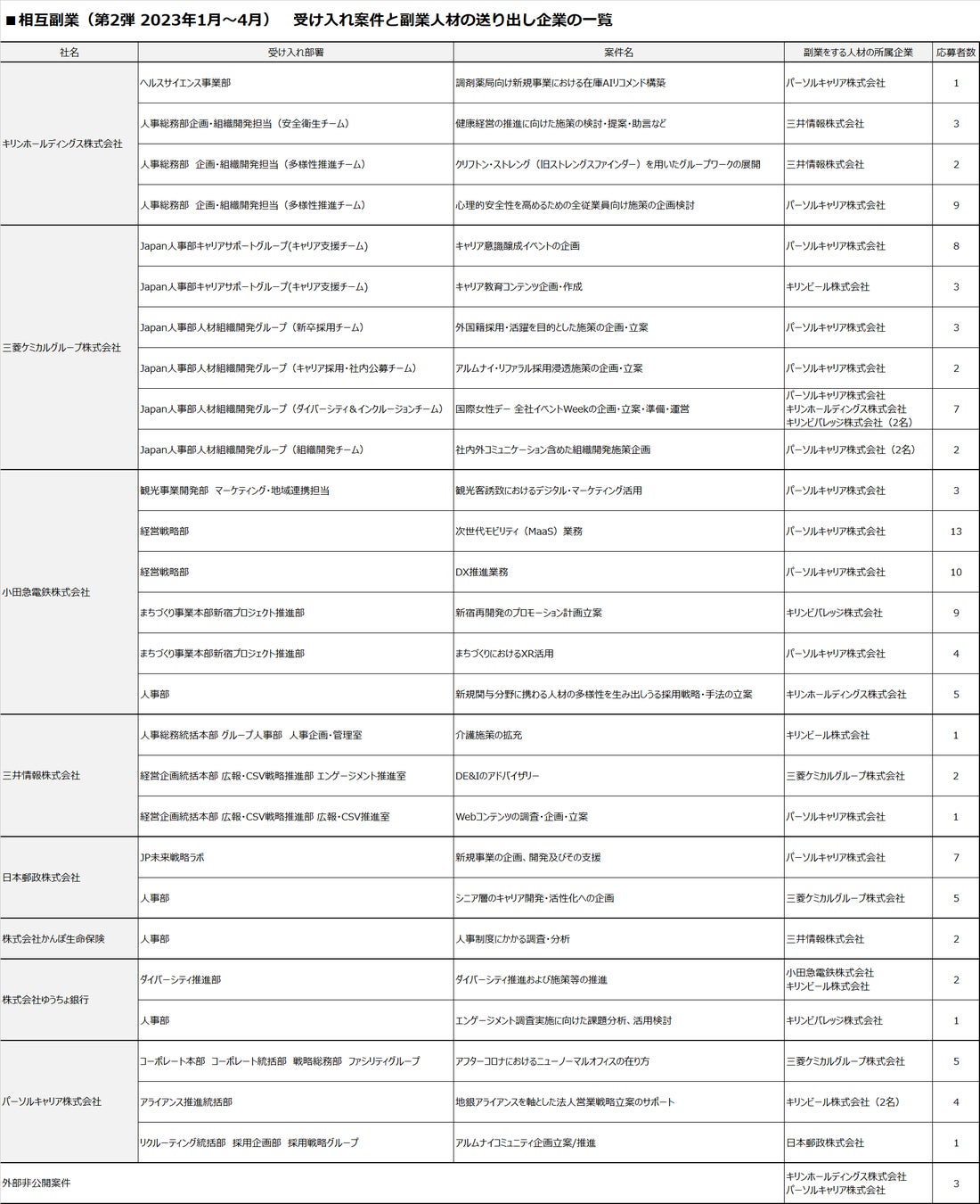 小田急電鉄株式会社、日本郵政株式会社、株式会社ゆうちょ銀行、株式会社かんぽ生命、三井情報株式会社、三菱ケミカルグループ株式会社などが新たに参加。9社から切り出した37の副業案件に対して、案件を切り出した企業のグループ会社を含む13社の社員がエントリー。受け入れ組織の面談を経て、最終的に28案件・35名の副業が成立しました。