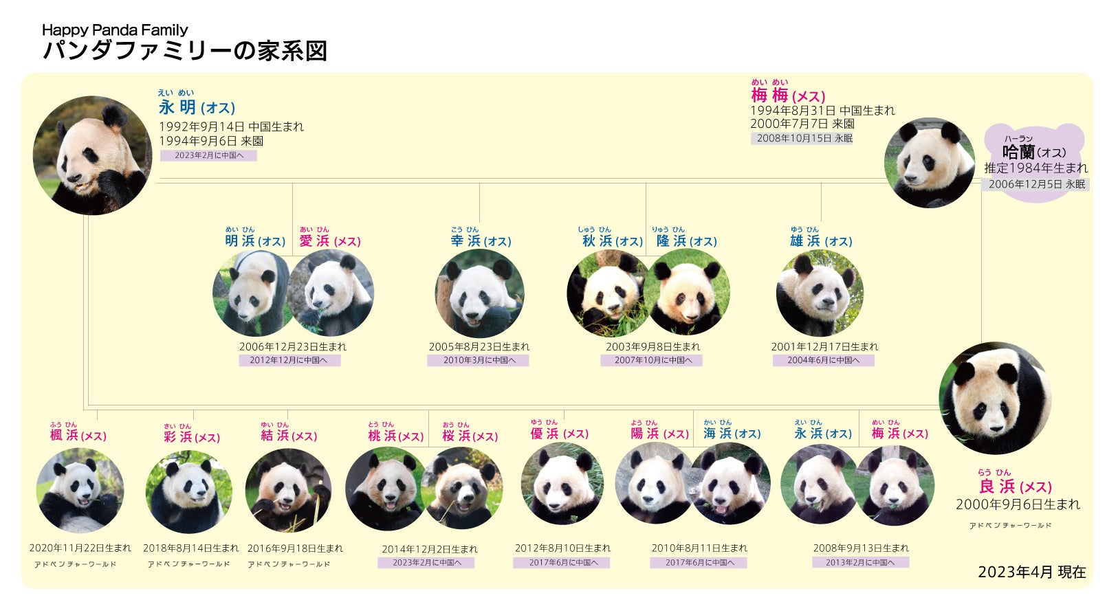 現在、野⽣のジャイアントパンダは、約1,800頭といわれ、その保護と個体数を増加させるため飼育下での繁殖研究が重要とされています。アドベンチャーワールドでは、1994年より、中国成都ジャイアントパンダ繁育研究基地の⽇本⽀部として、世界で初めてブリーディングローンによるジャイアントパンダ⾃然繁殖のための⽇中共同繁殖研究をスタート。のちに16頭の父親となる「永明(えいめい)※1」と「蓉浜(ようひん)」が来園しました。 2000年、「梅梅(めいめい)」を迎え、ジャイアントパンダをはじめ、関わるすべて の⼈々のしあわせを願う「しあわせ計画」を始動しました。「梅梅」は同年9月に当パーク初となる赤ちゃん「良浜」を出産し、その後も「永明」との間に合計6頭の赤ちゃんを生み育てました(2008年永眠)。また立派な母親に成長した「良浜」も、現在に至るまで10頭の赤ちゃんを育て上げ、しあわせの輪が広がっています。