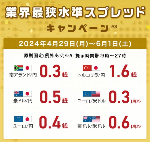 ※3 「業界最狭水準スプレッドキャンペーン」スプレッド(対象期間:2024年4月29日(月)午前9時00分~2024年6月1日(土)午前3時00分、提示時間帯:対象期間中の各営業日午前9時~翌午前3時)