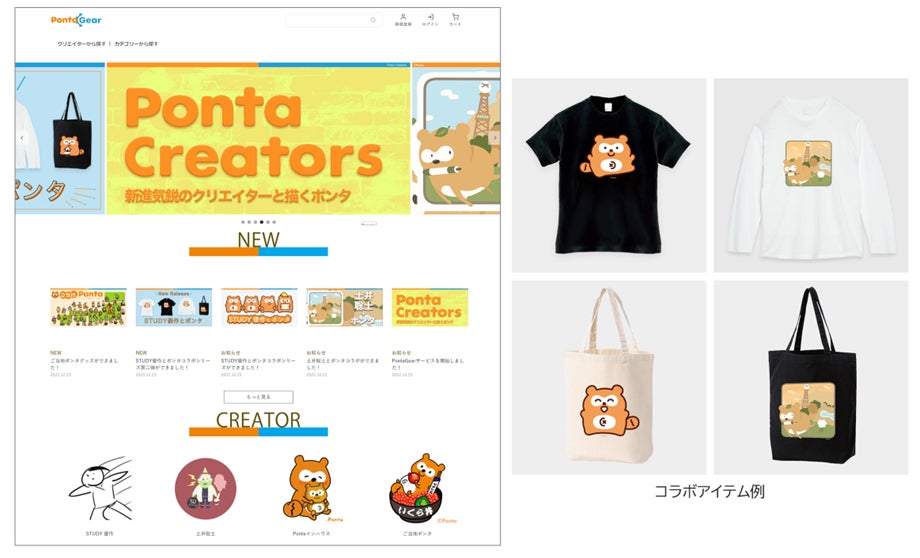 さまざまなクリエイターの方に、ポンタの特徴を残しつつご自身の作風を生かして描いていただいたポンタデザインのグッズやキャラクターとのコラボレーション商品を販売するECサイトです。これまでに、アーティスト・イラストレーターの「STUDY優作」さん、漫画家・イラストレーターの「土井 聡士」さんとのコラボを行いました。Tシャツやトートバッグ、キーホルダー、マグカップなど日常生活でお使いいただけるアイテムを取り揃えています。また、今後もさまざまな商品ラインアップを展開していく予定です。Ponta Gearを通じて、皆様にキャラクター「ポンタ」の新たな魅力をお届けします。