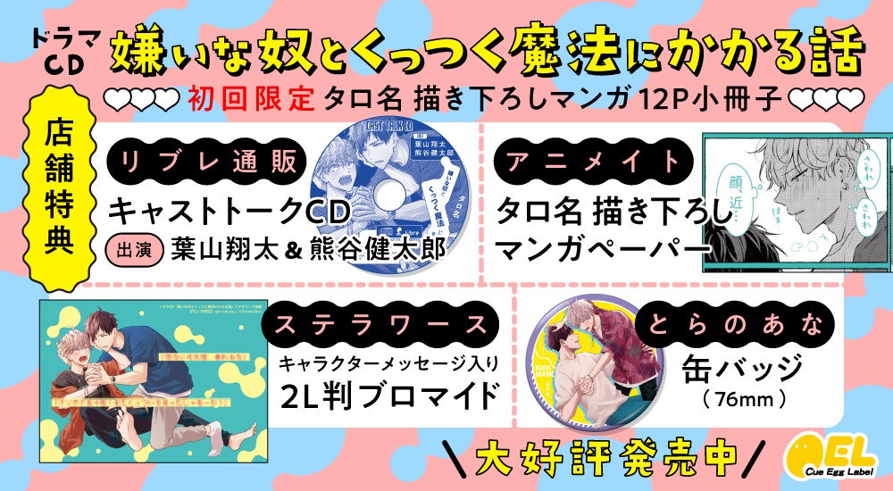 株式会社リブレ(本社:東京都新宿区、代表取締役社長:太田歳子)は、2022年7月29日(金)にドラマCD「嫌いな奴とくっつく魔法にかかる話」をCue Egg Labelより発売いたします。https://www.b-boy.jp/special/kiramaho/cd/