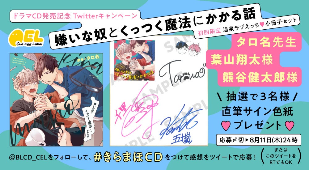 「嫌いな奴とくっつく魔法にかかる話」ドラマCD本日発売! タロ名先生・葉山翔太さん・熊谷健太郎さんの直筆サイン色紙が当たるTwitterキャンペーン開催中!