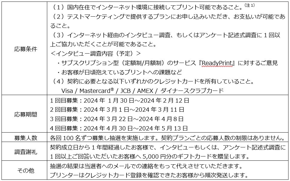 (注1)インターネット経由でインク使用量を検知してインクを自動配送します。そのためテストマーケティングのお申し込みには国内在住でインターネット環境に接続してプリント可能であることが条件となります。