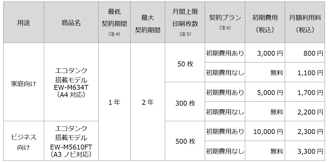 毎月定額をお支払いいただくことで、急なインク切れを心配する必要がなく、また故障時も無償で交換できるので、もしもの時も安心です。プランは家庭向け(月間上限印刷枚数50枚または300枚)とビジネス向け(月間上限印刷枚数500枚)、および初期費用あり・なしの合計6プランからご利用環境に合わせてお選びいただけます。プリンターを一括払いで購入することに迷われているお客様には最適のサービスです。