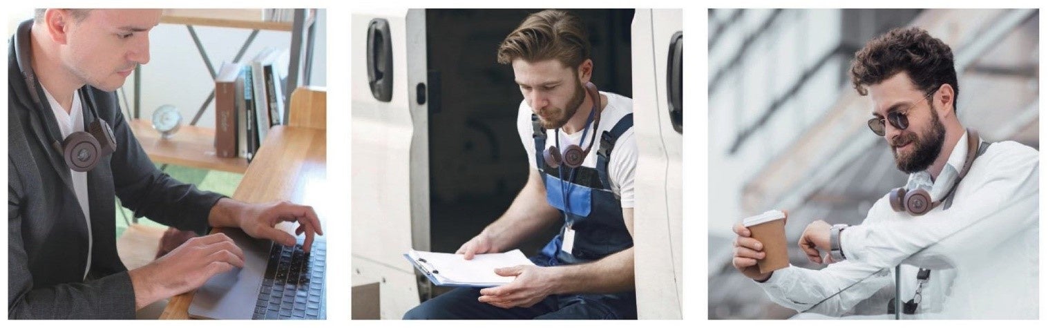 ダブルファンハンズフリーは、首から掛けるタイプなので両手が自由になり、あらゆる場面で快適に過ごせます。さらに新モデルの<ダブルファンハンズフリーwithコールレシーバー>はWEB会議やBluetooth機能で電話通話中に扇風機を使用しても風音が聴こえにくく涼みながら会話に集中できます。また、音は、自分には良く聞こえ周りには聴こえにくいため、音楽鑑賞も気を遣わず楽しめます。