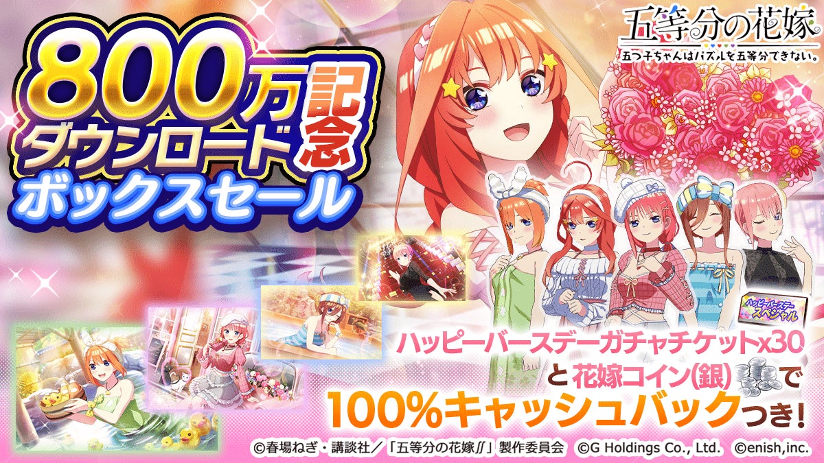 株式会社enish(本社:東京都港区、代表取締役社長:安徳 孝平、以下enish)は、アニメ「五等分の花嫁」初となるゲームアプリ『五等分の花嫁 五つ子ちゃんはパズルを五等分できない。』にて、国内累計ダウンロード数800万を突破したことをお知らせします。この度の800万ダウンロード突破への感謝の気持を込めて花嫁コイン555個を8日間プレゼントや、800万ダウンロード記念ボックスを実施いたします。