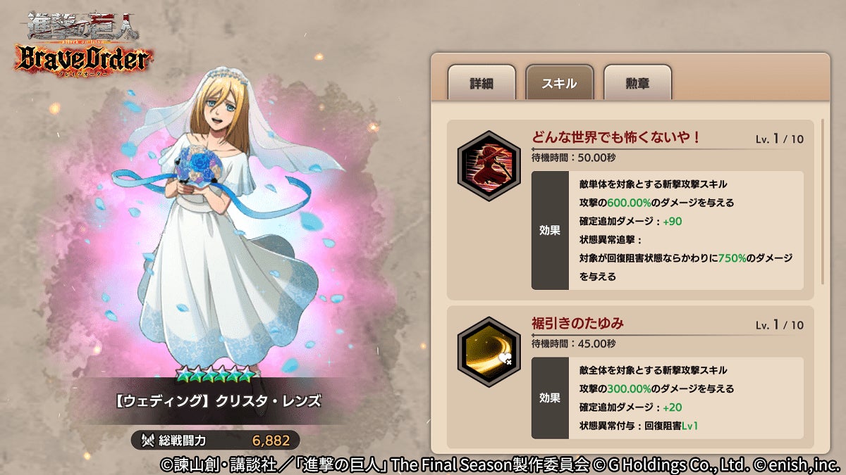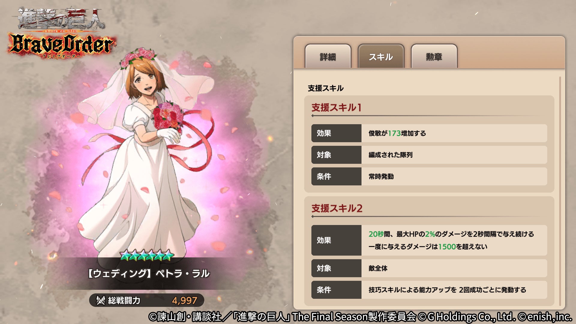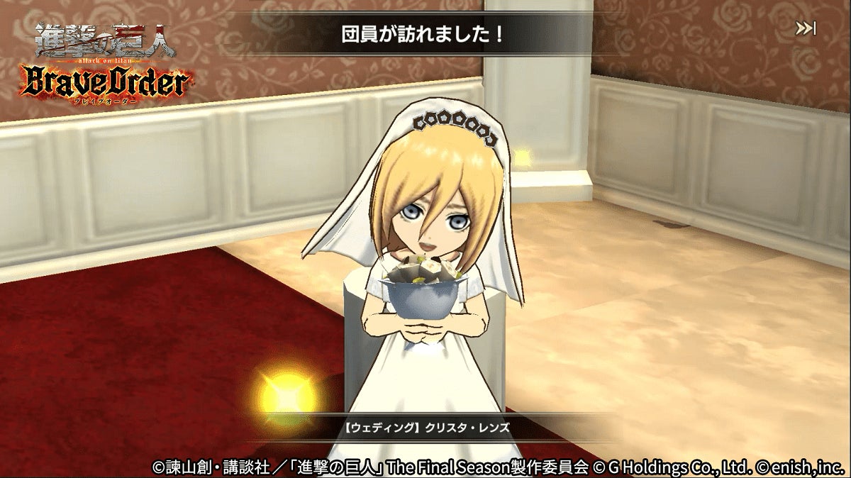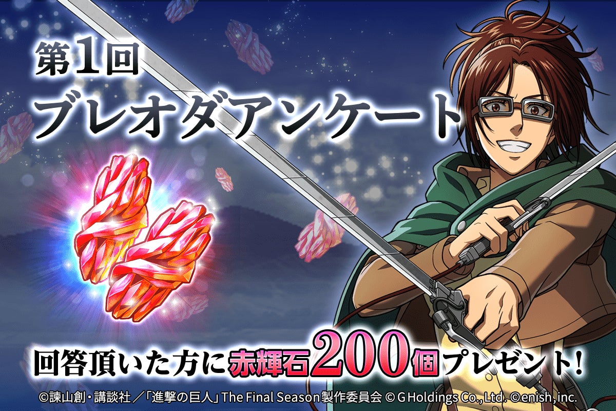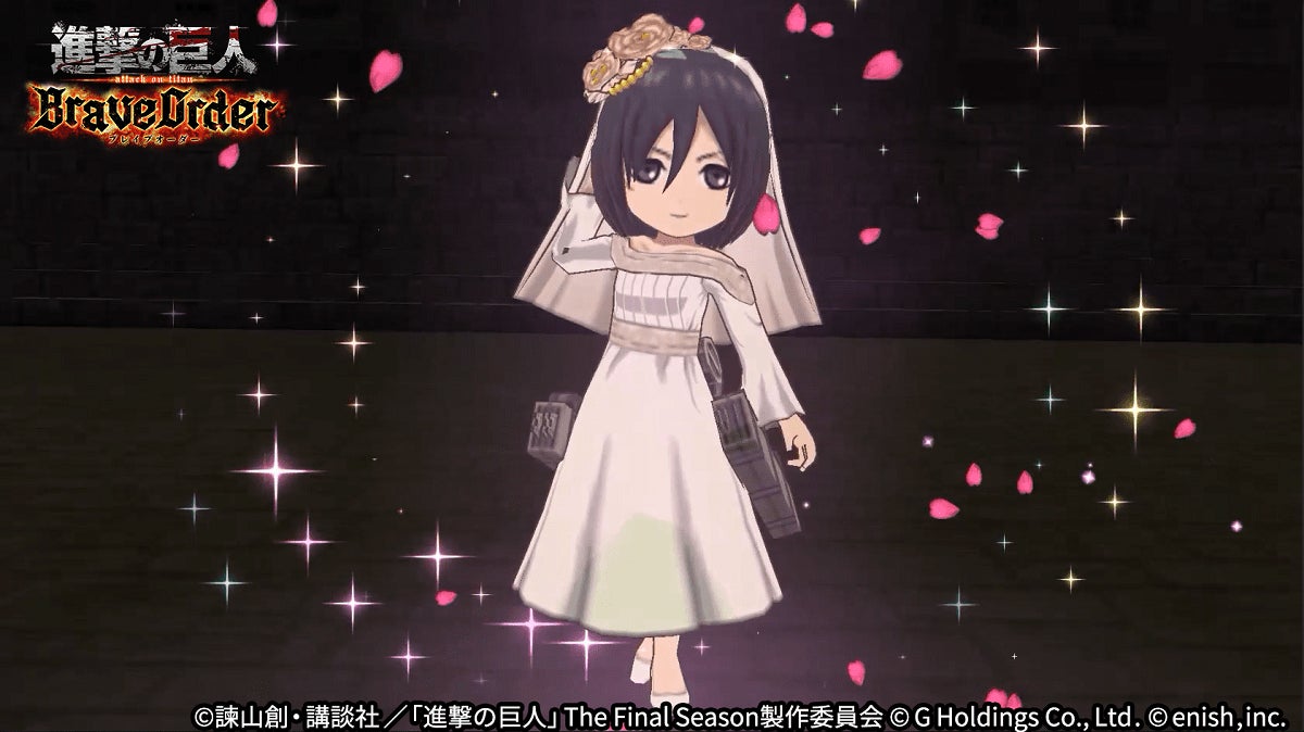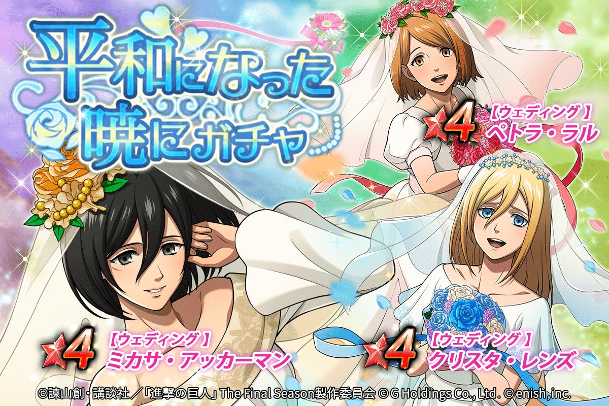 株式会社enish(本社:東京都港区、代表取締役社長:安徳 孝平、以下enish)は、アニメ『進撃の巨人』のスマートフォンゲーム最新作「進撃の巨人Brave Order」にて、新イベント「平和になった暁に」を開催!イベントアイテムの「イアリング」と「ティアラ」を集めて豪華報酬をGETしよう!また、本日より新登場の【ウエディング】ミカサ・アッカーマン、【ウエディング】クリスタ・レンズ、【ウエディング】ペトラ・ラルがピックアップされた「平和になった暁にガチャ」も同時開催!さらに、回答すると赤輝石がもらえちゃう、第1回ブレオダアンケートや生放送のアンケート企画で決定した特別なログインボーナスも実施!その他、最新情報はゲーム公式サイト・ゲーム公式Twitterアカウントにて随時公開して行きますので、ぜひご覧ください。