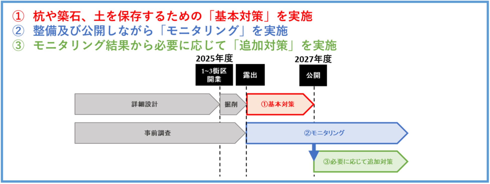 高輪築堤を構成する杭や築石の腐朽・塩類析出対策等の保存科学や高輪築堤の構造安定性などについて、有識者のご指導のもと技術的な検討を行い、適切な保存対策および継続的な維持管理を行うことで、高輪築堤跡の現地公開が可能となりました。今後、現地公開に向けて、具体的な検討を進めていきます。(参考1参照)