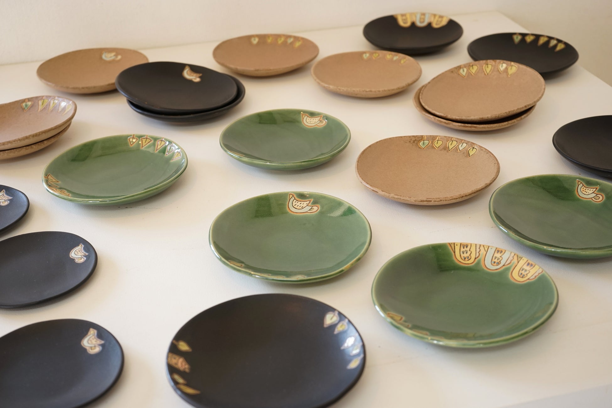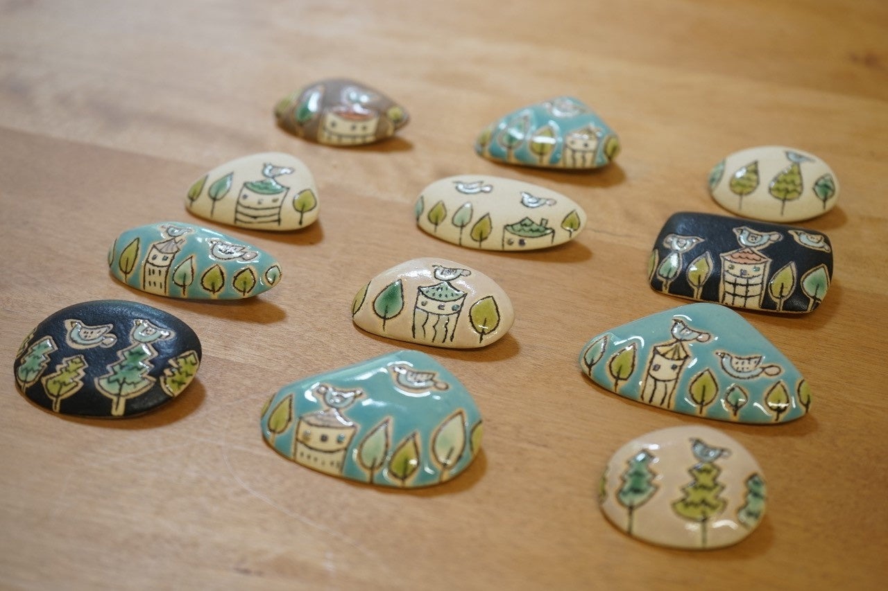 私のアトリエは森に囲まれた自然豊かな場所にあり、鳥たちの楽しそうな鳴き声や木々が風にゆれ動く音を聞きながら日々作陶しています。そんなのんびりと穏やかな世界を少しでも作品に感じていただければとても嬉しいです。