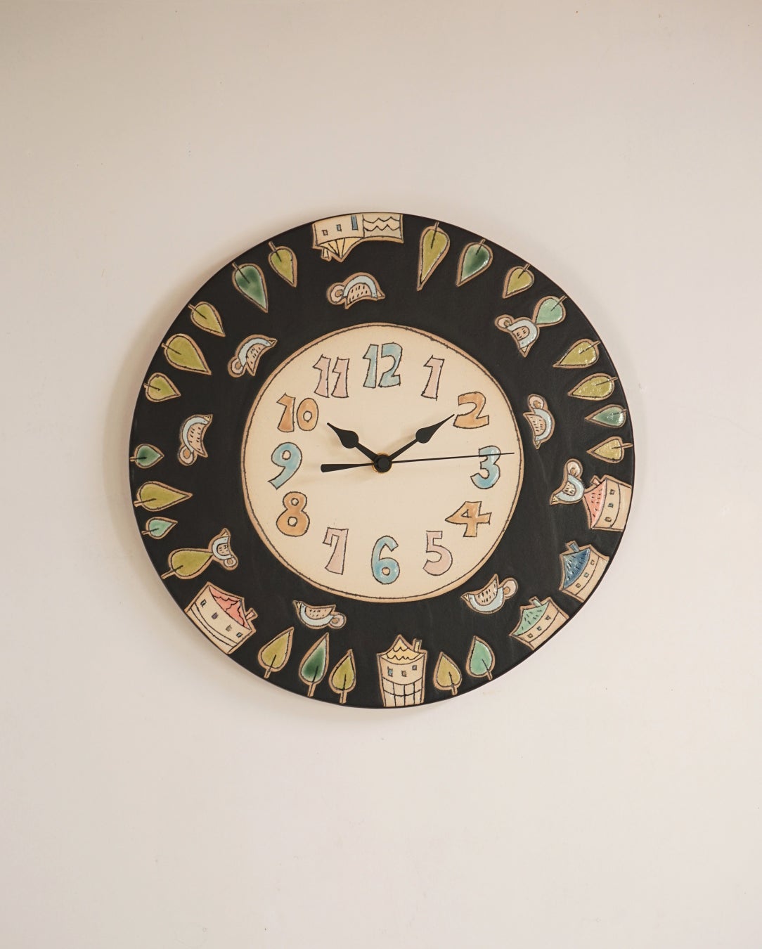 本展では、メインの作品でもある壁掛け時計を中心に、カップや器、オブジェ、アクセサリーなど、数多くの作品が並びます。それらの作品は、筆で柄を描くのではなく、液状にした粘土(化粧土)を彫った模様に入れていく「象嵌(ゾウガン)」という技法が用いられており、模様には立体的な奥行きが生まれます。