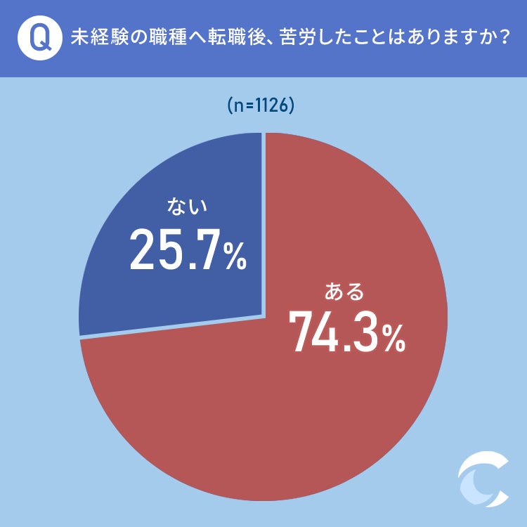 また、未経験だったために苦労したという方が74.3%、未経験の職種へ挑戦して良かったと思ったことがある方が78.2%となりました。