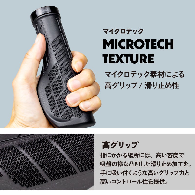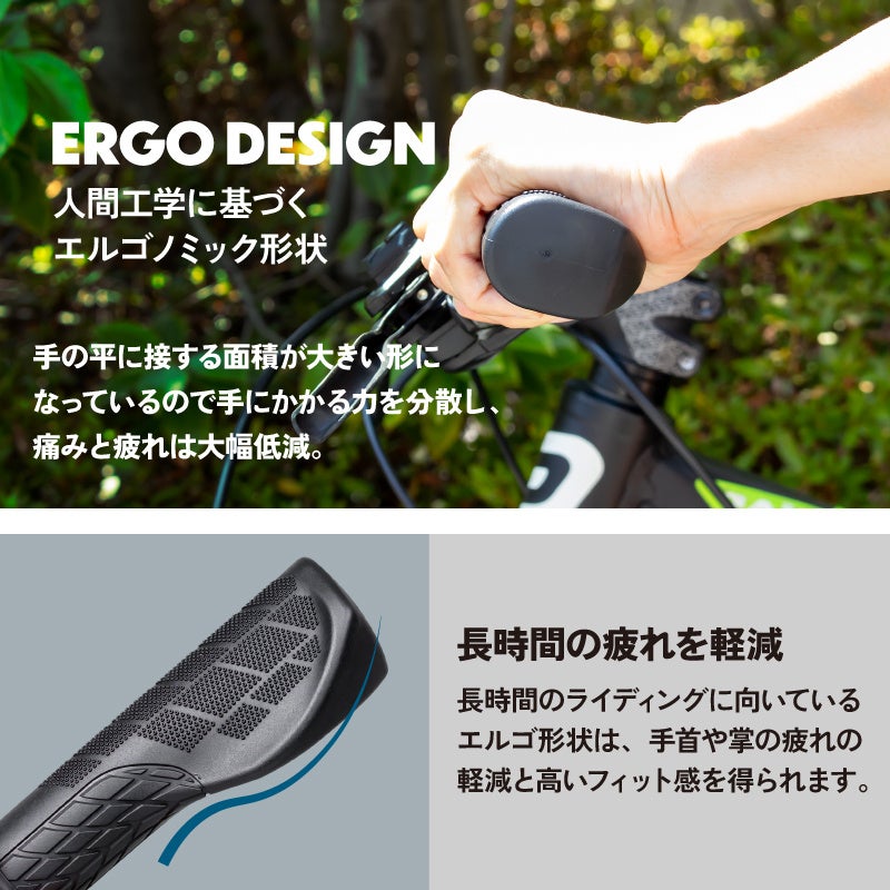 長時間のライディングに向いているエルゴ形状は、手首や掌の疲れの軽減と高いフィット感が期待できます。