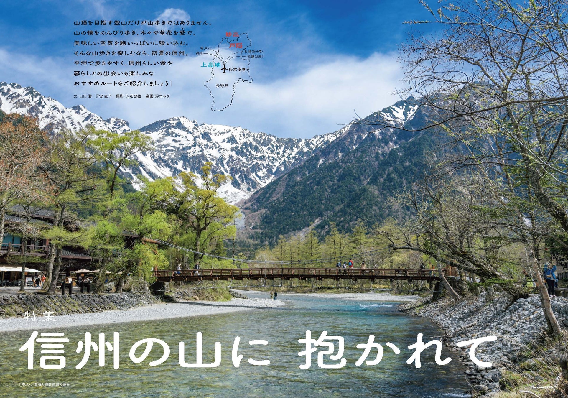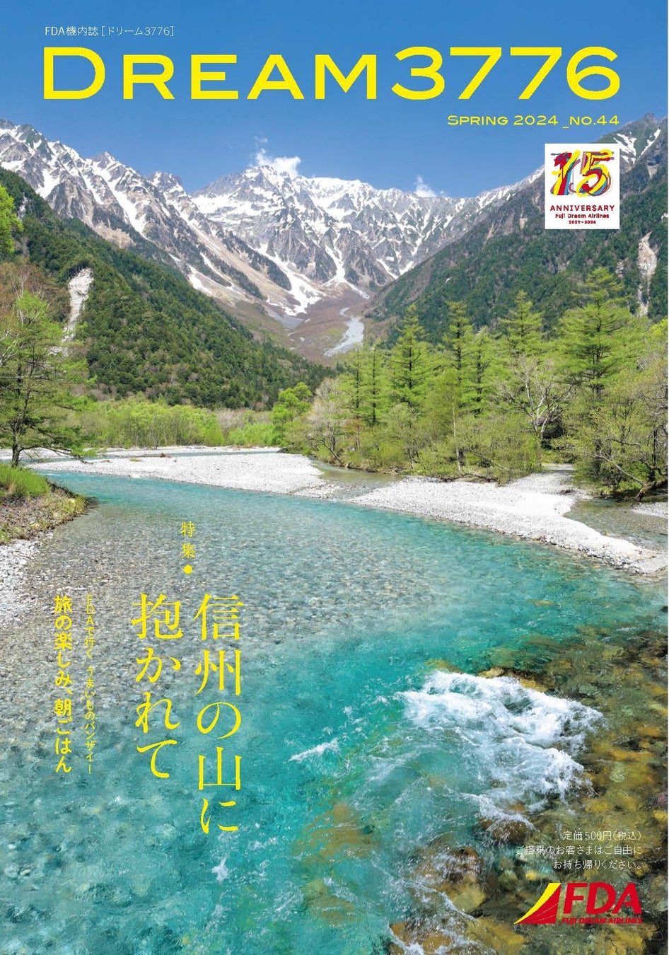 今回の機内誌「DREAM3776 ”2024年春号”」では、長野県・新潟県にまたがる山への旅を特集します。絶景を満喫する上高地のネイチャーウォーク、妙高・戸隠の「あまとみトレイル」のふたつのエリアを取り上げ、登山する人でなくても楽しむことができる信州エリアの山々の魅力をご紹介します。FDA便にご搭乗の際は、同機内誌をお楽しみください。