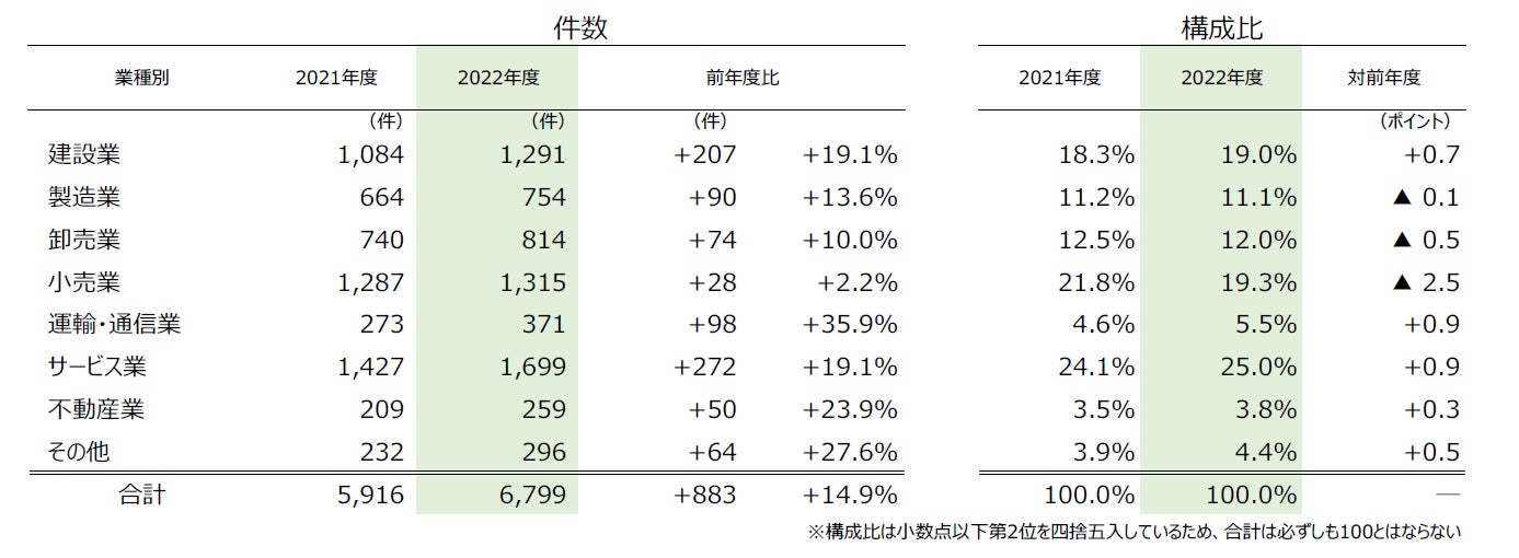 - 業種別にみると、14年ぶりに全業種で前年度を上回った。最多は『サービス業』(前年度1427件→1699件、19.1%増)で、『小売業』(同1287件→1315件、2.2%増)が続き、コロナ関連の倒産が目立った