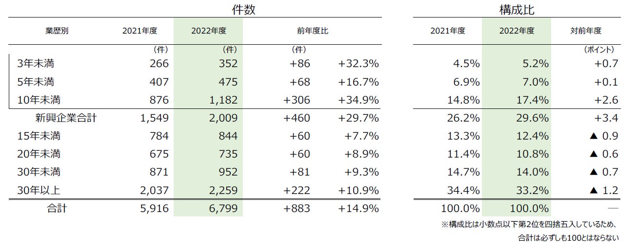 - 業歴別にみると、業歴10年未満の新興企業は14年ぶりに400件以上増加