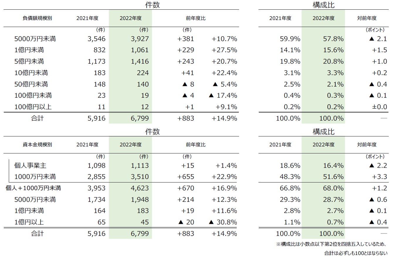 資本金規模別では、『1000万円未満(個人事業主含む)』の倒産は4623件(前年度3953件、16.9%増)発生し、全体の68.0%を占めた。
