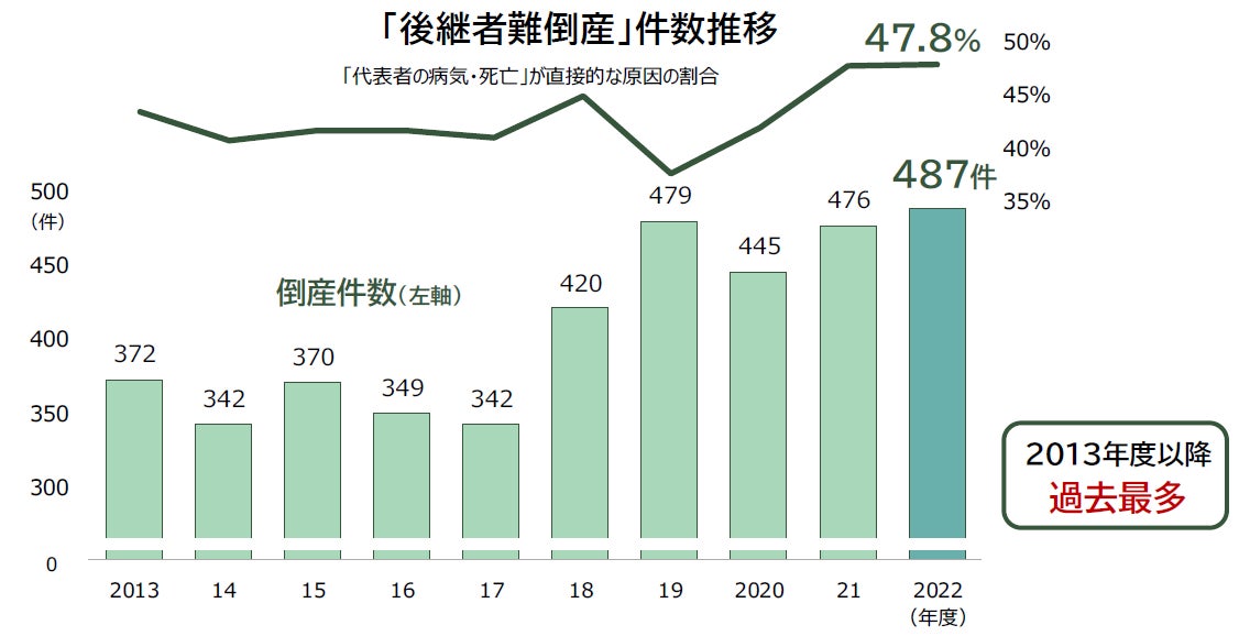 後継者難倒産は、2022年度において487件(前年度476件、2.3%増)発生し、年度ベースで過去最多を更新した。2022年の後継者不在率が60%を下回り過去最低を更新するなか、事業承継を円滑に進められなかった中小企業の倒産が増加している。特に、「代表者の病気・死亡」が直接的な原因となった倒産は全体の半数を占め、高止まりの傾向が続いた。