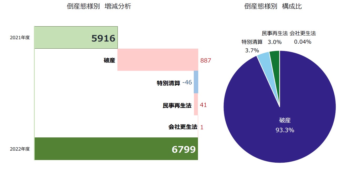 「破産」は6341件(前年度5454件、16.3%増)が最も多く、リーマン・ショック時の2008年度以来14年ぶりに800件以上の増加を記録した。会社分割など第二会社方式で多用される「特別清算」は249件(同295件、15.6%減)で2年連続の減少となった。