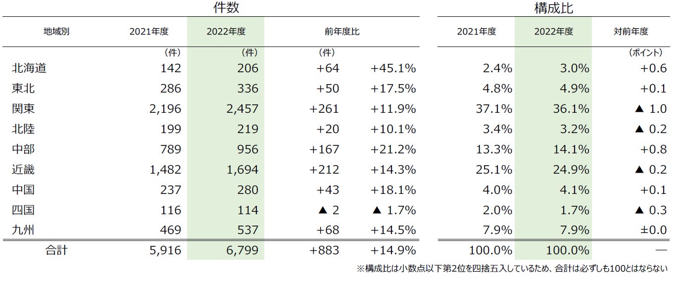 - 地域別にみると、『四国』除く全地域で前年度比増加。『北海道』(前年度142件→206件、45.1%増)は、全地域で唯一コロナ禍直前の2019年度(201件)を超えた。『中部』(同789件→956件、21.2%増)は食品関連産業で増加が目立った
