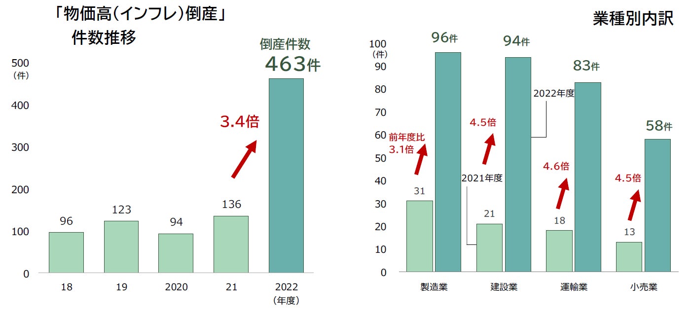 物価高(インフレ)倒産は、2022年度において463件(前年度136件、240.4%増)発生し、前年度の3.4倍に急増、過去最多を更新した。業種別にみると、原材料高騰が続く「製造業」と「建設業」が90件を超えた。前年度からの増加が最も大きいのは、燃料費高騰などの要因を受けたトラック運送業など「運輸業」で、前年度比4.6倍に急増した。