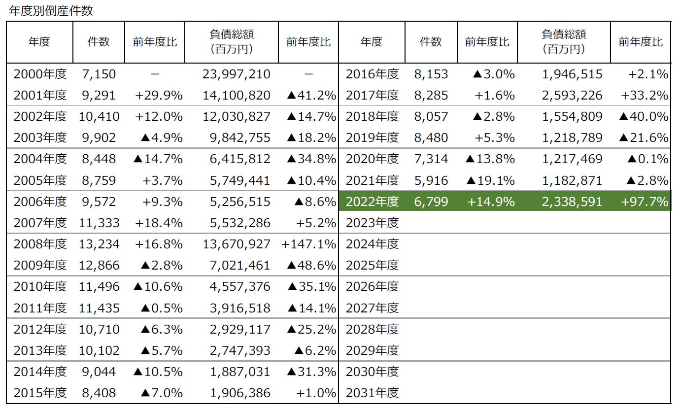 2022年度の倒産件数は6799件(前年度5916件、14.9%増)となり、2019年度以来3年ぶりに増加した。2022年5月から2023年3月まで11カ月連続で前年同月を上回り、前年度から800件以上の大幅増となったのは2008年度以来14年ぶり。
