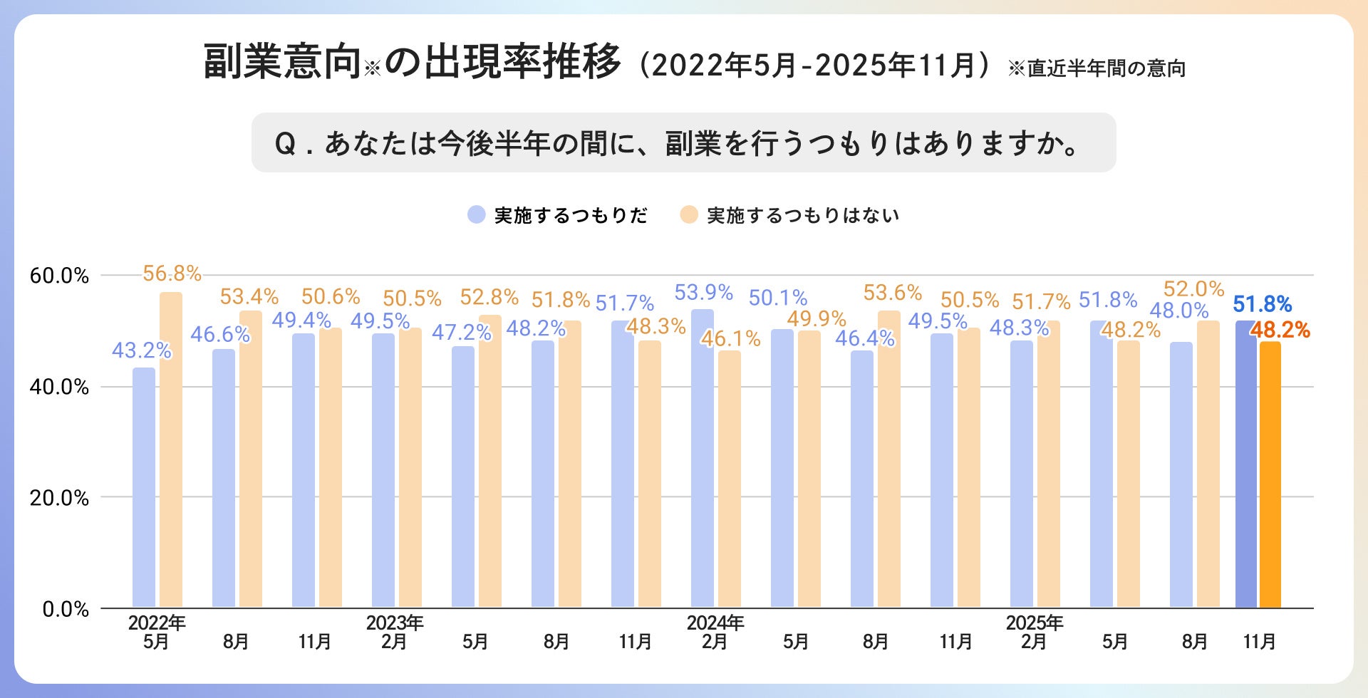 また、今後「副業を実施するつもりだ」と回答した人は51.8%となり、前回調査から3.8ポイント増加しましたが、「副業を実施するつもりはない」と回答した人は、こちらも前年同月(2024年11月)と比べると2.3ポイント減少しています。