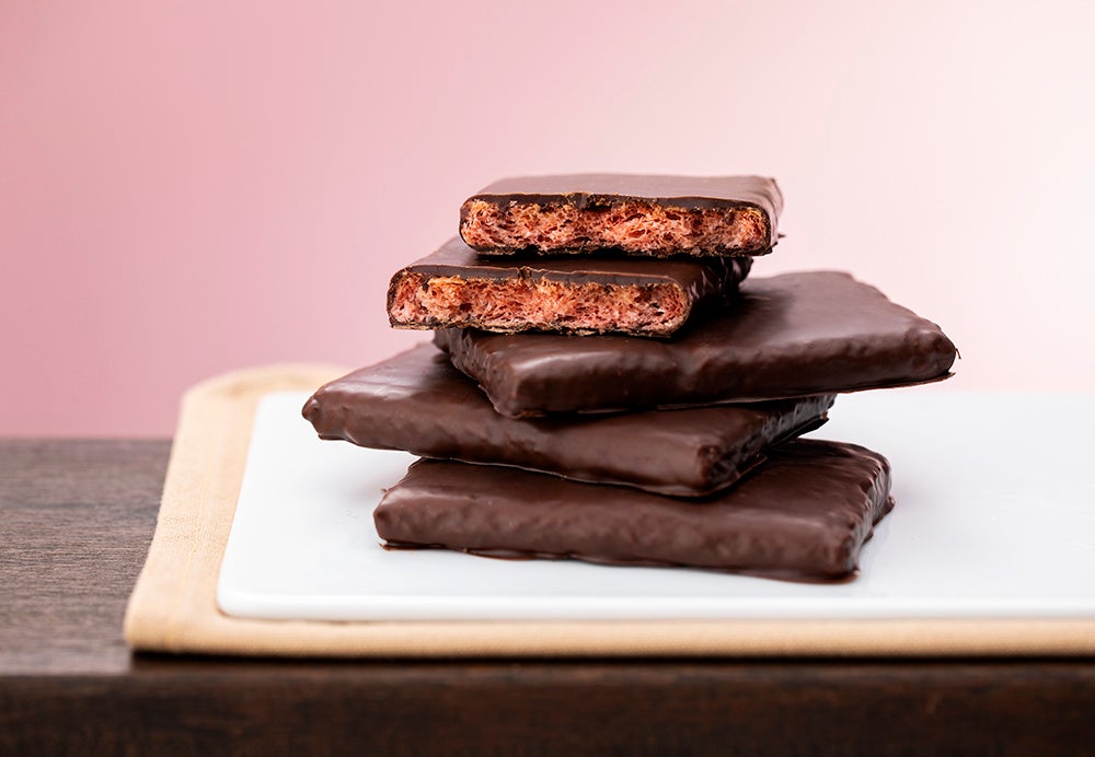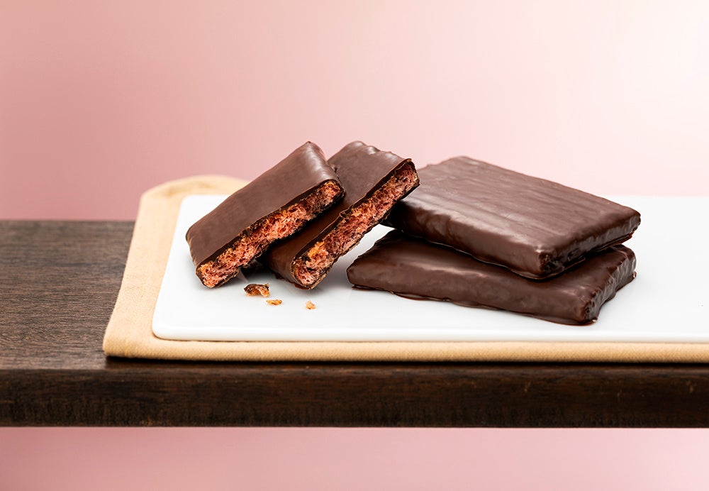 外側のチョコレートには「銀のぶどう」が誇る炭火焙煎クーベルチュールを溶かしこんだ“濃密ショコラ”を使用しています。いちごが香る自慢のシリアル生地全面にたっぷりかけた、甘酸っぱい季節限定リッチタイプです。まるでいちごのチョコフォンデュのようなおいしさをぜひ味わってみてください!