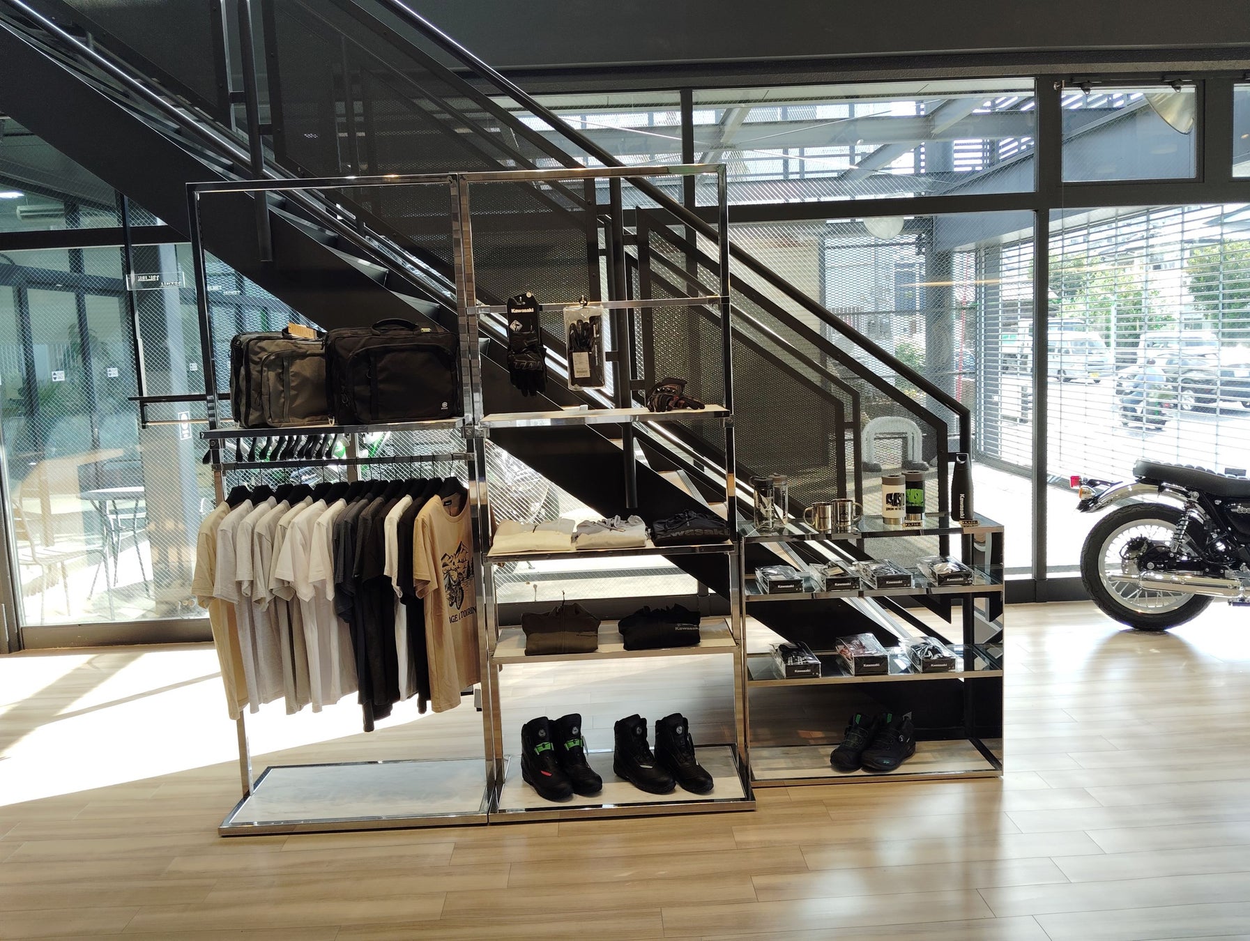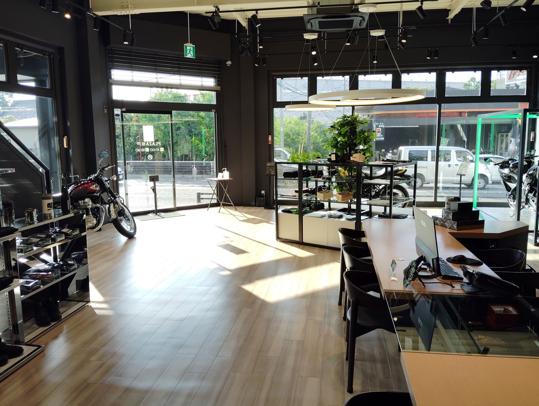 木目調のフロアと白い天井が織りなす明るい店内。モーターサイクルとプラザアパレルがゆったりと展示され、どなたでも楽しめる空間としています。