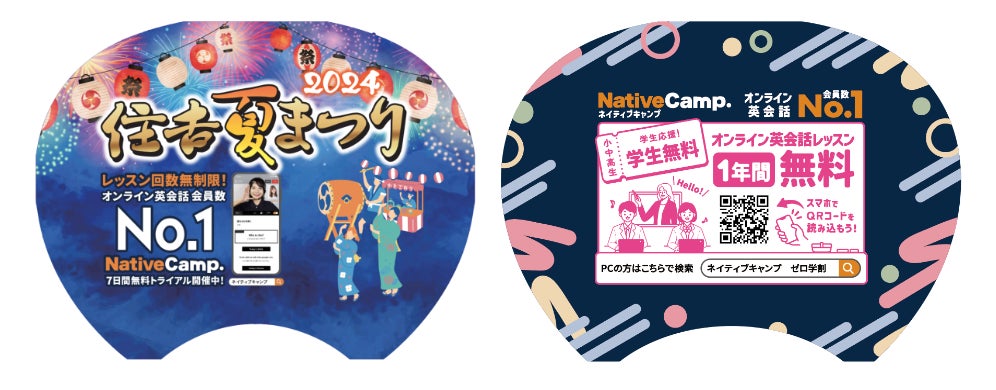 お祭りに合わせてオリジナルのうちわを作成し、来場者に配布しました。うちわには、地域の小中高生が無料で英語学習を始められる「ゼロ学割」の情報を記載し、多くの学生に英語学習の機会を提供しました。