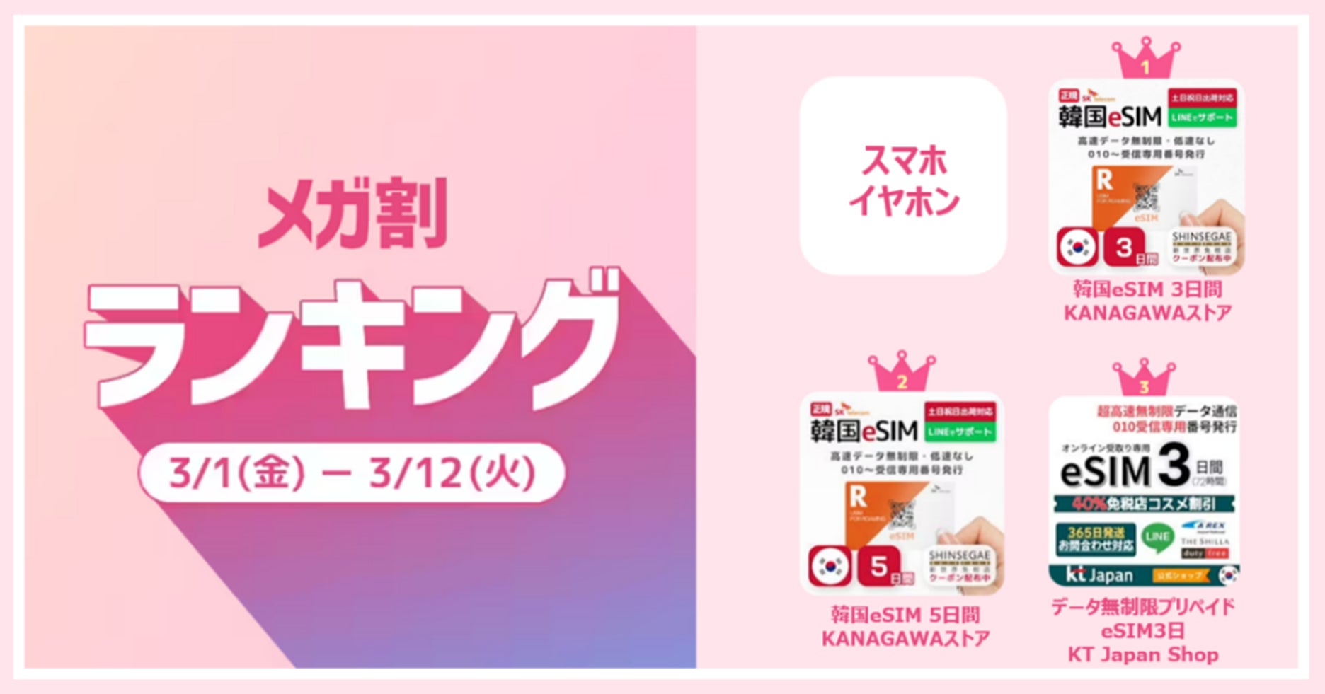 <スマホ・イヤホン>1位 韓国eSIM 3日間(KANAGAWAストア)