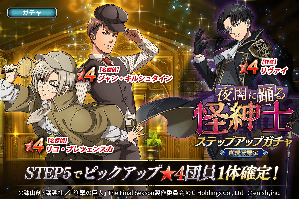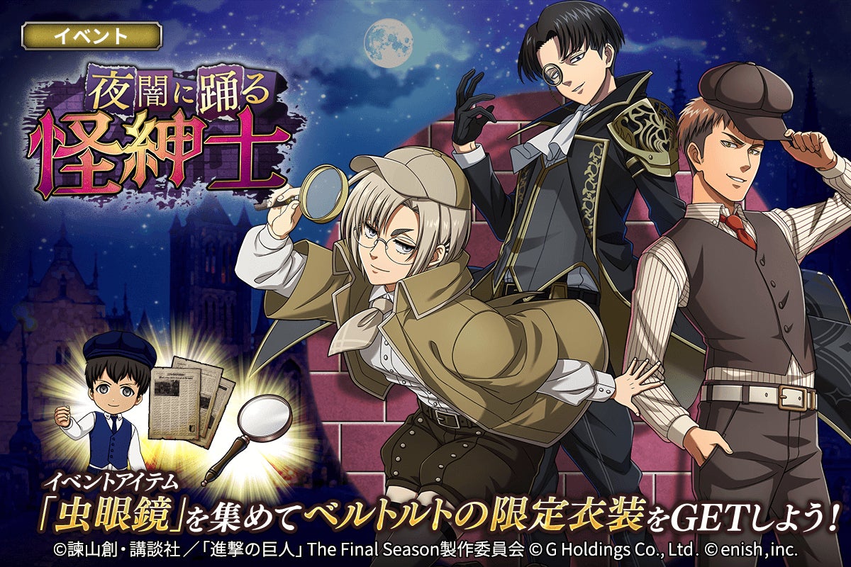 株式会社enish(本社:東京都港区、代表取締役社長:安徳 孝平、以下enish)は、アニメ『進撃の巨人』のスマートフォンゲーム最新作「進撃の巨人Brave Order」にて、11月30日(水)より新イベント「夜闇に踊る怪紳士」を開催!イベントアイテムを集めて限定の「ベルトルトの衣装」を手に入れよう!また、本日より新登場の【怪盗】リヴァイ、【名探偵】ジャン・キルシュタイン、【名探偵】リコ・ブレツェンスカがピックアップされた「夜闇に踊る怪紳士ガチャ」も同時開催!その他、最新情報はゲーム公式サイト・ゲーム公式Twitterアカウントにて随時公開して行きますので、ぜひご覧ください。