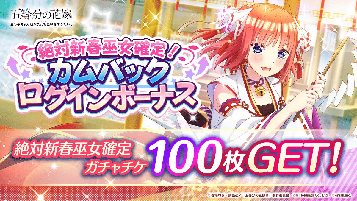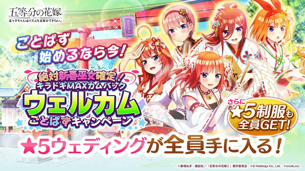 株式会社enish(本社:東京都港区、代表取締役社長:安徳 孝平、以下enish)は、2022年12月26日(月)より、アニメ「五等分の花嫁」初となるゲームアプリ『五等分の花嫁 五つ子ちゃんはパズルを五等分できない。』にて、「絶対新春巫女確定!キラドキMAXカムバックキャンペーン」を開催いたします。