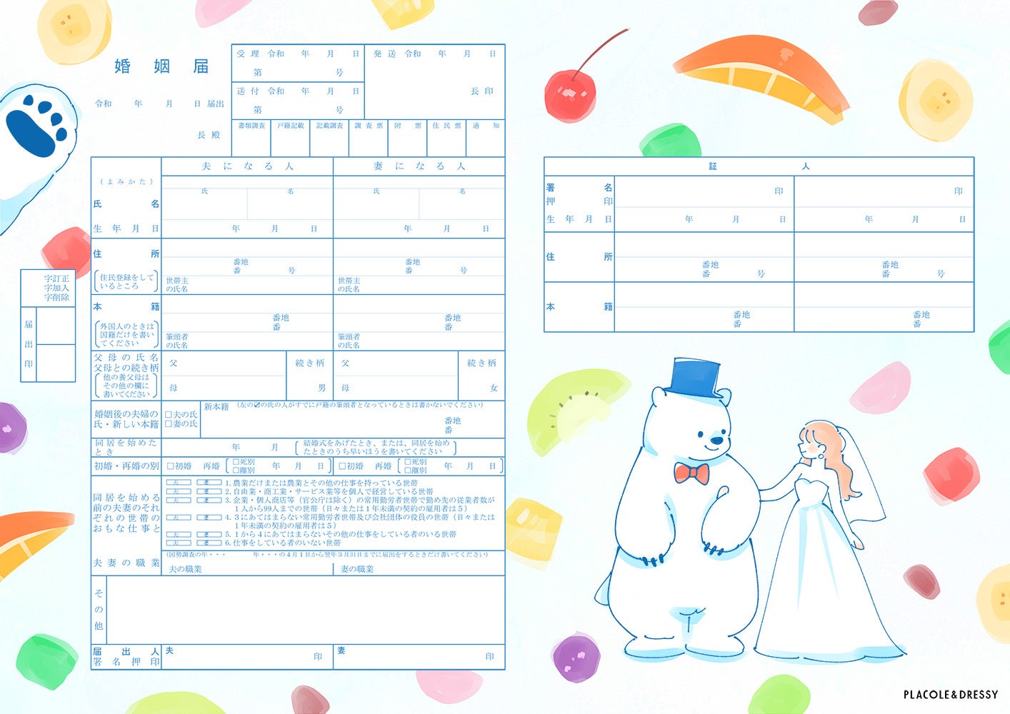 鹿児島県のご当地スイーツ「しろくま」がテーマ!しろくまの見た目をそのまま婚姻届をしたような、爽やかでカラフルな楽しいデザインです。