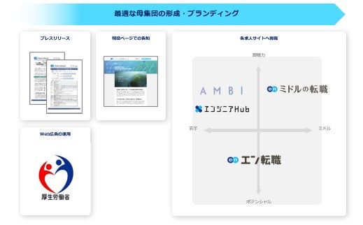 プレスリリースや特設ページ、Web広告での告知に加え、各求人サイトでの集客支援を行ないます。『エン転職』『AMBI』『ミドルの転職』『エンジニアHub』とターゲットの異なる4つの求人サイトを活用することで、ターゲットへ網羅的に求人を届けます。