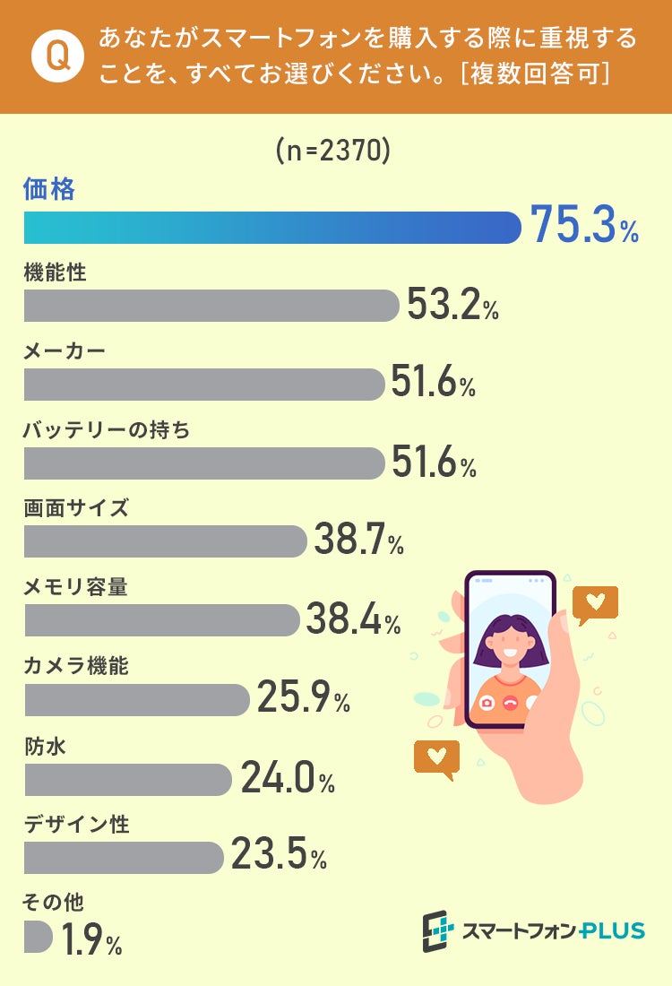スマートフォンを購入する際に何を重視するかという質問では、「価格」と回答した方が75.3%ともっとも多い結果になりました。