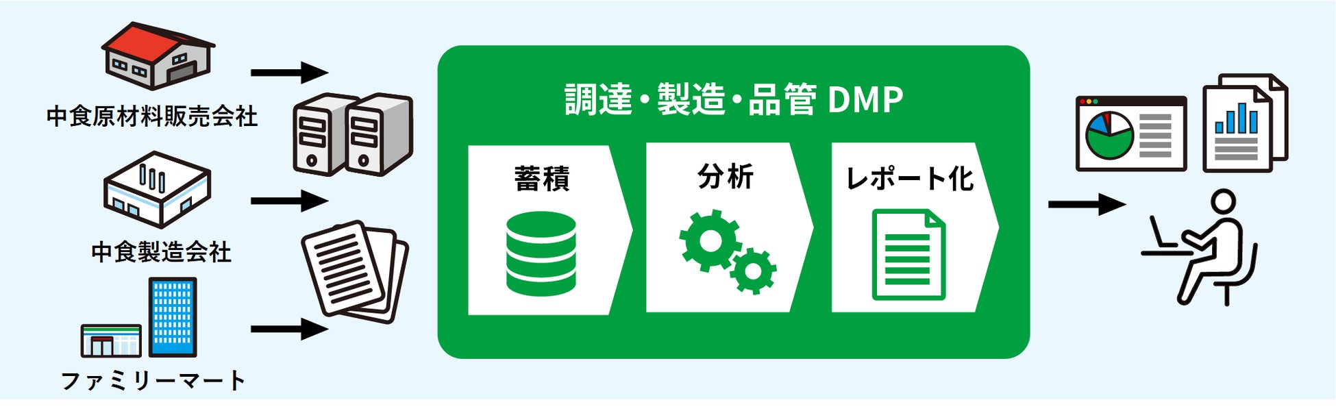 フューチャーアーキテクトは2021年よりファミリーマートのIT戦略パートナーとして、ITガバナンスとシステム品質強化をはじめAIなどのテクノロジーを活用した業務効率化・高度化を支援し、配送最適化を実現するためのデータプラットフォーム「配送DMP」※1を構築しました。今回の「調達・製造・品管DMP」は、2023年12月に構築した「配送DMP」とともにファミリーマートのサプライチェーン改革を支える仕組みとして、ファミリーマートと中食原材料販売会社、中食製造会社などのサプライチェーン上のプレイヤーが保有するデータの一元管理を可能にするプラットフォームです。データの横断的な活用による情報共有と継続的な業務改善、業務効率化に加え、ファミリーマートが自社でデータ分析やレポート化を行うための内製化も実現可能にしました。