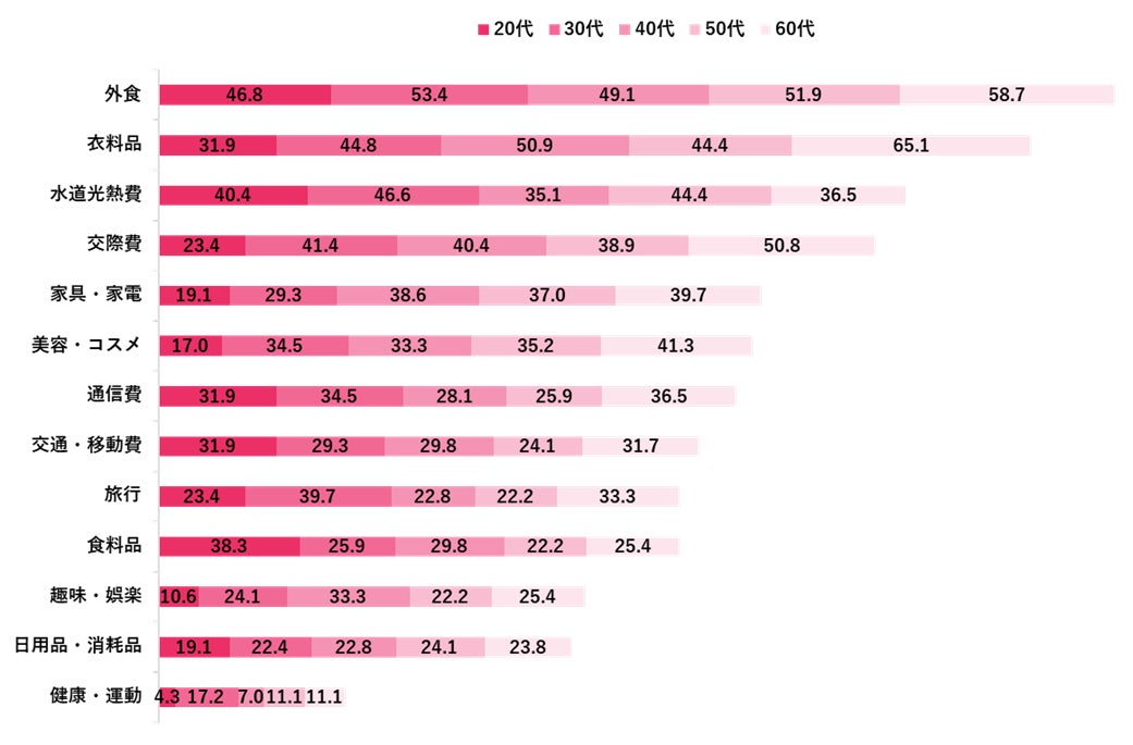 特にお金を掛けたくないもの1位「外食」、2位「衣料品」、3位「水道光熱費」