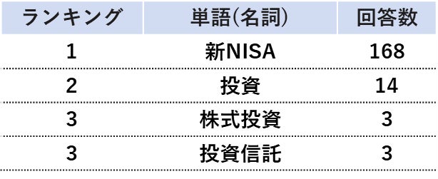 年代別で見ると、20代と30代においては「貯蓄・投資」が3割を超える。また、2024年に新たな投資計画があるかを聴取したところ、20代の27.0%が2024年に「新たな投資計画がある」と回答した。新たな投資計画の詳細について自由回答をテキストマイニングしたところ、「新NISAを始める」といったコメントが多く挙がり、出現数の多い名詞を集計すると「新NISA」が最多となった。
