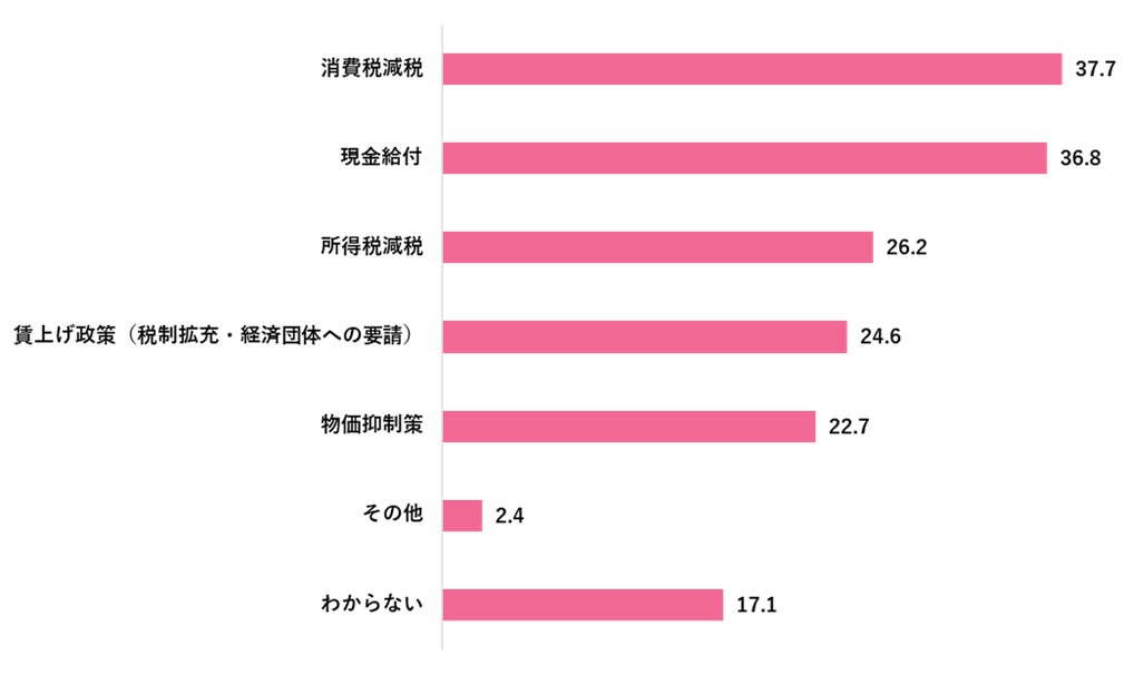 財布のひもが緩むきっかけとして、効果があると思う国の政策は「消費税減税」(37.7%)、「現金給付」(36.8%)