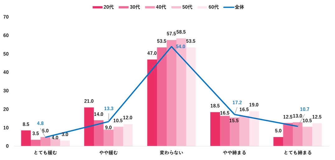 2024年の財布のひもの締まり具合は「変わらない」が54.0%、次いで「やや締まる」が17.2%。20代では「やや緩む」が21.0%