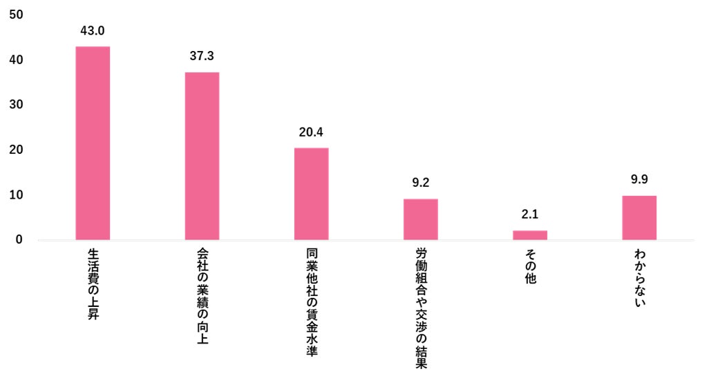 賃上げの期待があると回答した方を対象に、賃上げの期待はどのような要因に基づいているか聴取したところ、「生活費の上昇」が43.0%でトップ、次いで「会社の業績の向上」が37.3%だった。