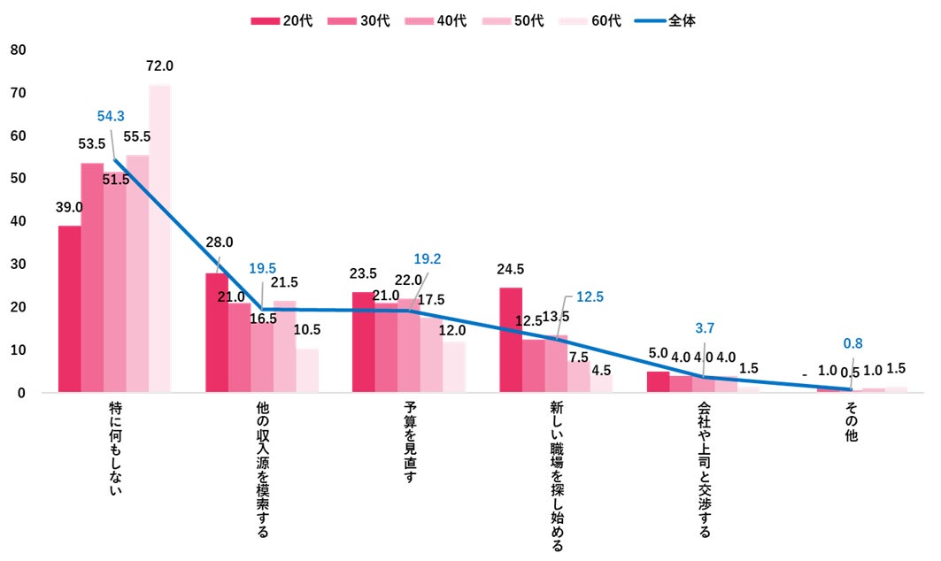 また、この春の賃上げがなかった場合の行動として、「特に何もしない」が全体で54.3%と最も高かったが、20代の約3割は「他の収入源を模索する」「新しい職場を探し始める」と回答し、他の年代と比較して高かった。